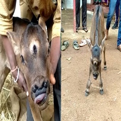 في حالة نادرة من نوعها، أنجبت بقرة في قرية براجناندجاون في الهند، عجلا بثلاث عيون وأربع فتحات أنف، وفق "آسيان نيوز انترناشيونال".