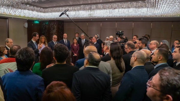 وفي العاصمة بكين، كانت المحطة الأولى للرئيس الأسد والسيدة الأولى أسماء الأسد، لقاء جمعهما بعدد من أفراد الجالية السورية المقيمين في الصين، اللقاء كان مناسبةً للحديث عن الوطن ودور الجالية تجاهه في المرحلة المقبلة، والعلاقة مع الصين وكيف يساهم السوريون في تعزيزها وتقوية مجالاتها، وعن التجربة الصينية الفريدة التي وضعت الصين في مقدمة دول العالم، وكيف نستفيد ونتعلم منها.