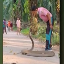 أظهر مقطع فيديو يحبس الأنفاس، رجلاً تايلندياً متخصصاً باصطياد الأفاعي وهو يقوم بالإمساك بكوبرا عملاقة مستخدما يديه فقط. ويقوم الرجل الذي تم تعريفه بأنه صائد أفاع، بمناورة مع كوبرا عملاقة، مستخدماً يديه فقط، في الوقت الذي تقوم فيه الأفعى بمحاولة الدفاع عن نفسها. وكان الرجل يحاول إبعاد الأفعى عن الطريق كيلا تتعرض للدهس، بمقاطعة كرابي جنوب تايلند. وأشارت الصحيفة إلى أن الأفعى التي تزن 10 كيلوغرامات ويبلغ طولها 4.5 أمتار، قد وصلت للطريق من إحدى مزارع النخيل، بعدما حاولت الاختباء في خزان للصرف الصحي بمنزل أحد السكان المحليين.