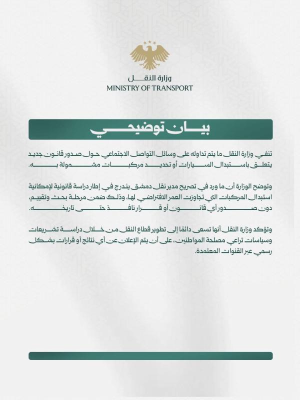 وتؤكد الوزارة، أن تصريح مدير نقل دمشق يندرج في إطار دراسة قانونية لإمكانية استبدال المركبات التي تجاوزت العمر الافتراضي لها.